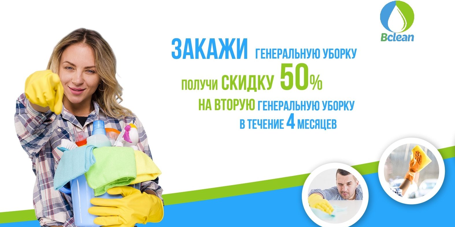 Специально для вас клининговая компания «Bclean» подготовила щедрый подарок – закажи генеральную уборку и получи скидку 50% на вторую генеральную уборку в течении 4 месяцев.